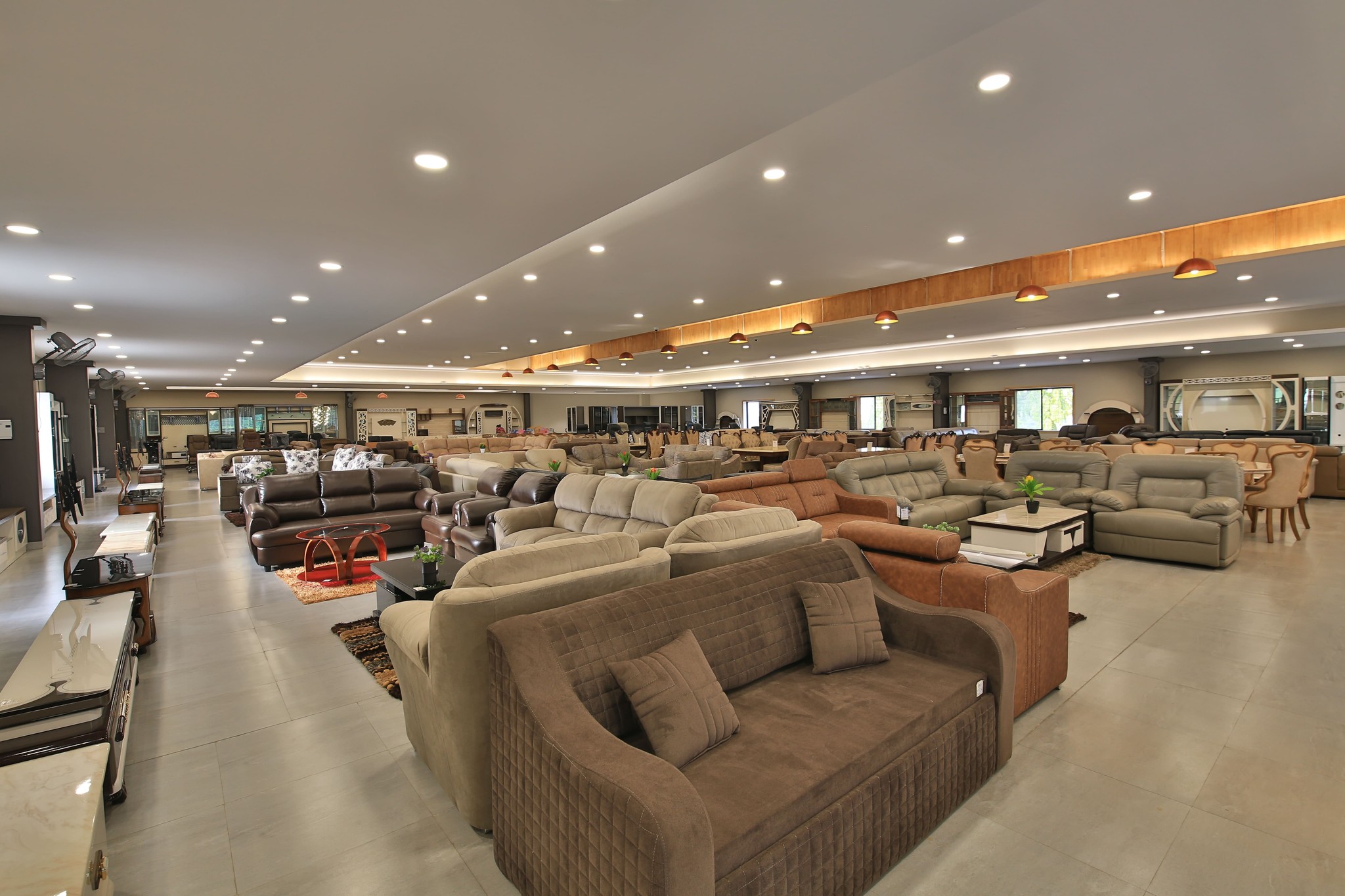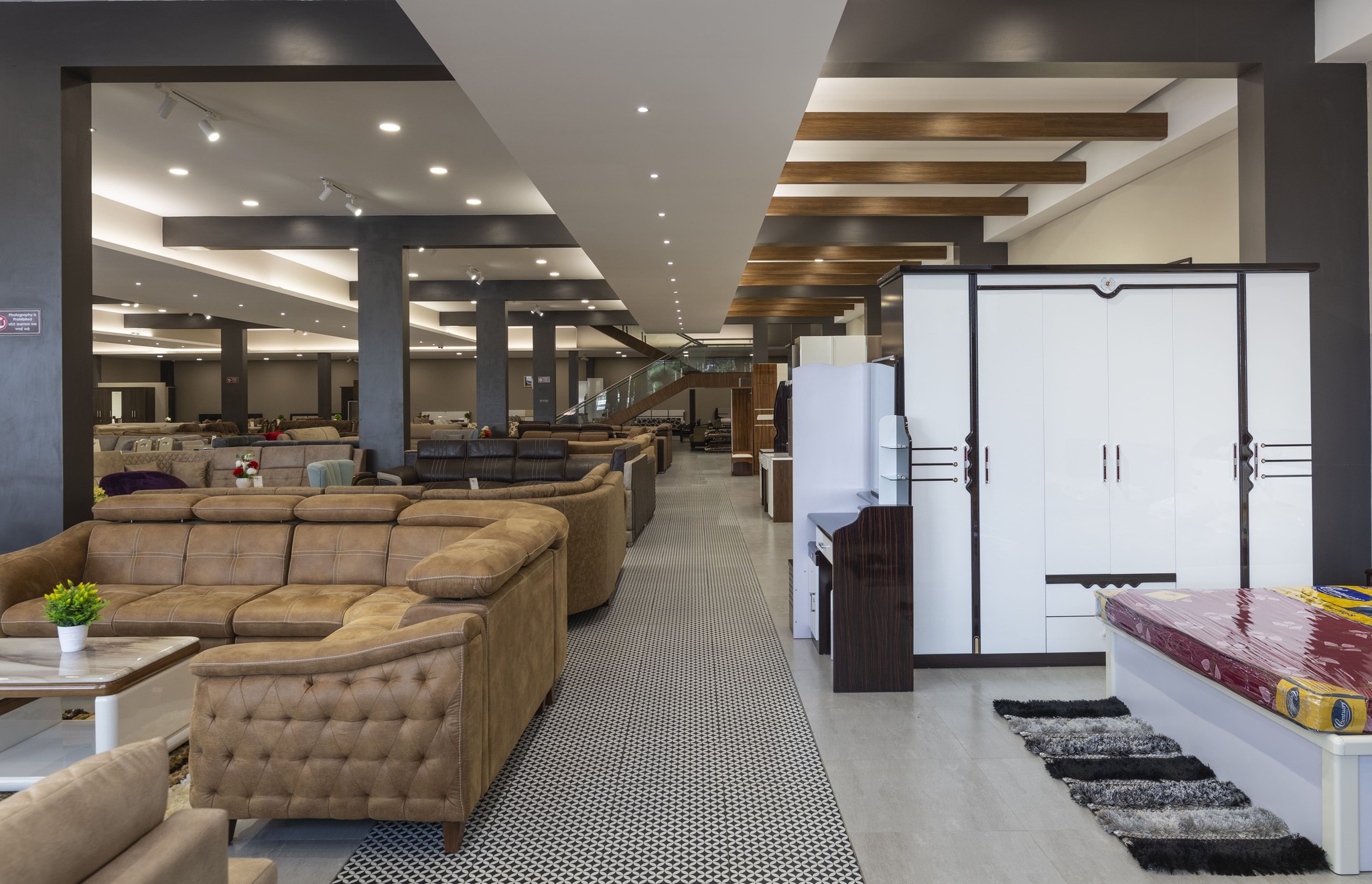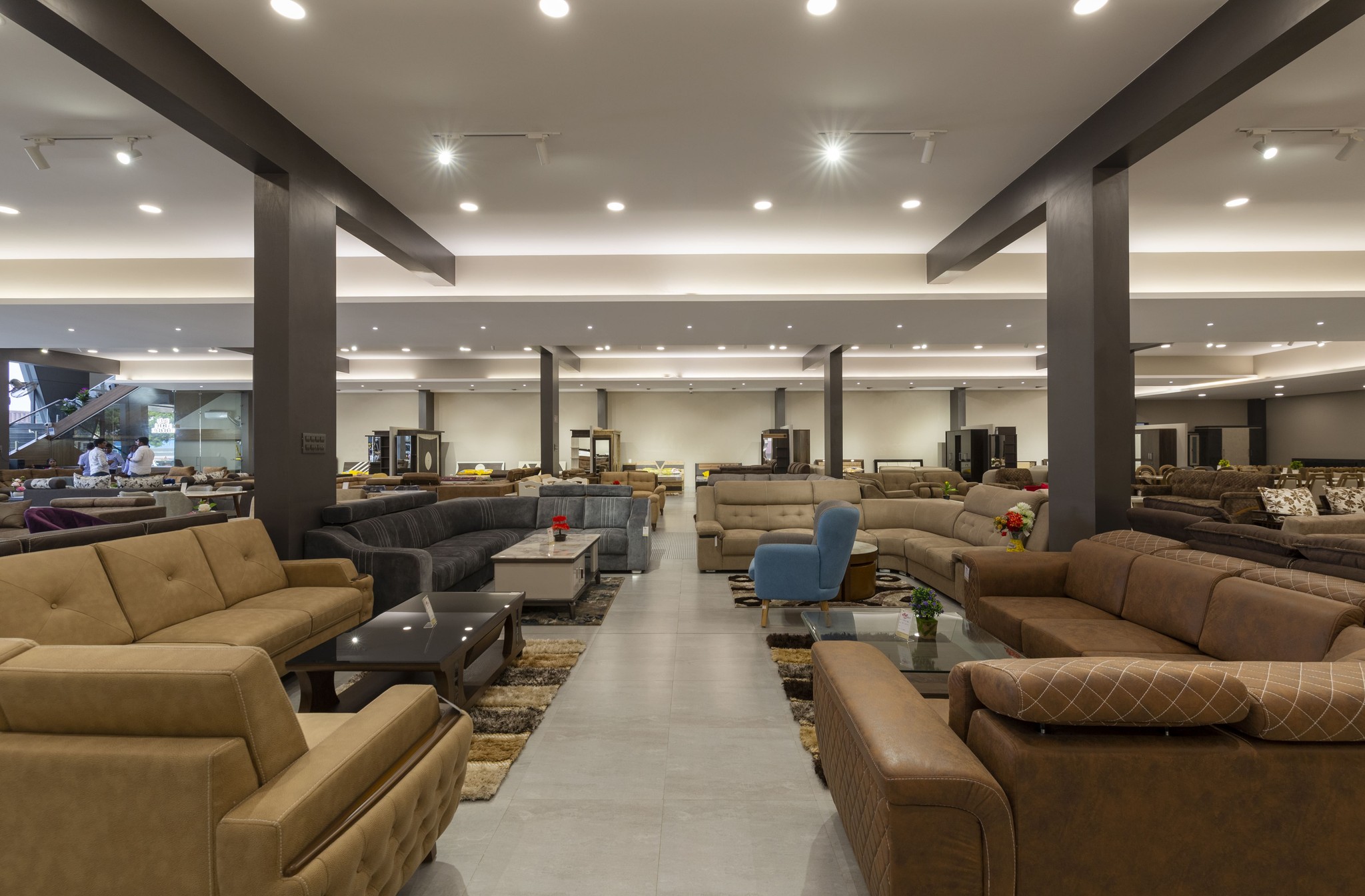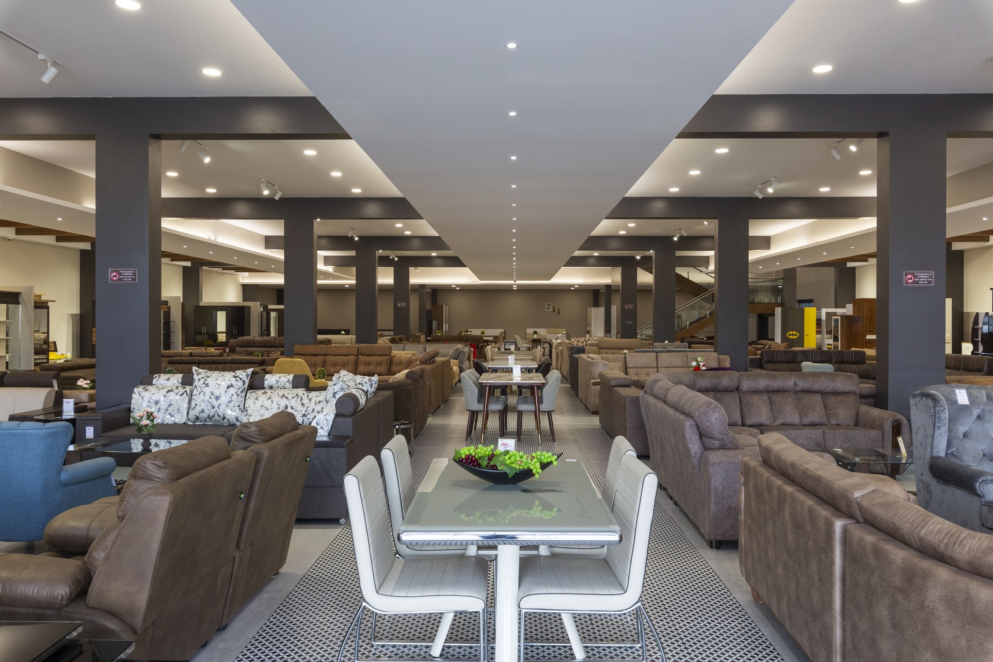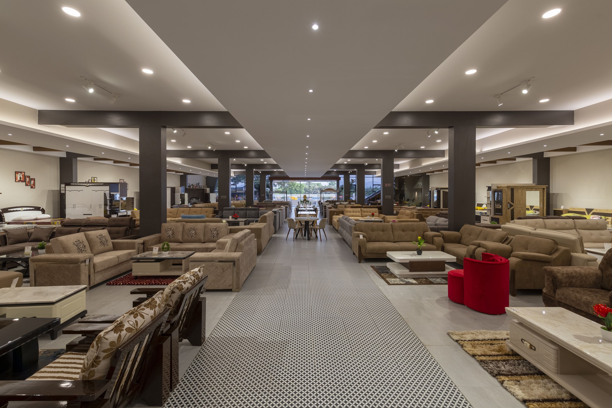 The design brief for the furniture mall was straightforward: create a pre-engineered structure that could be quickly assembled to house a large space for displaying furniture. Our approach to the exterior was to create a modern, bold architectural style for the façade that would be easily identifiable from the highway. Inside, we wanted to create a pleasant, muted visual backdrop for the multi-coloured items on display. At no point we felt that one should get the feeling of being inside an industrial, pre-engineered shed.