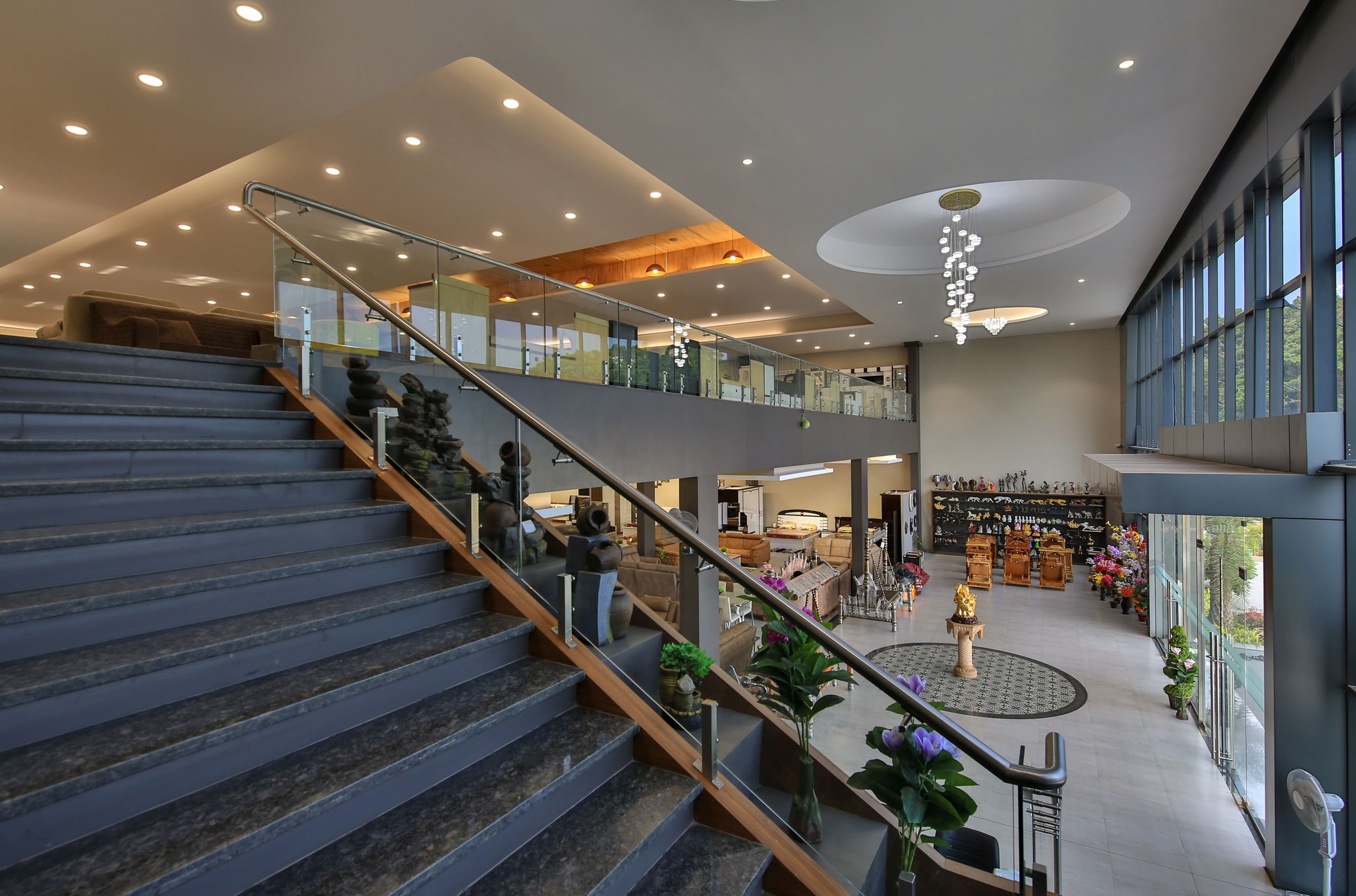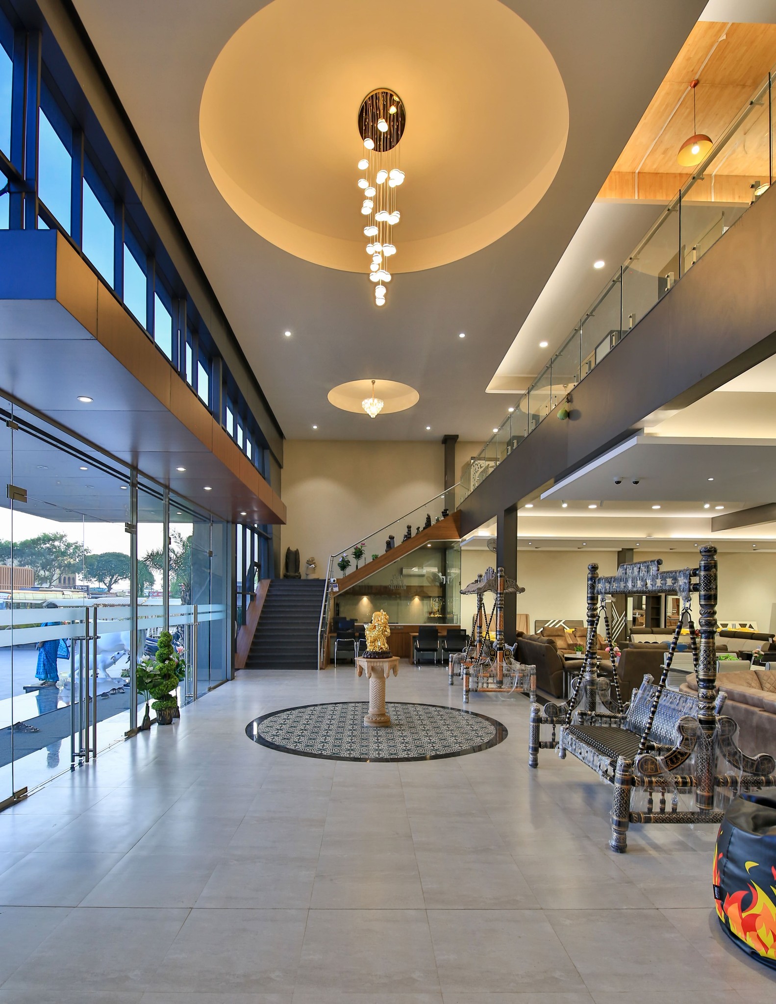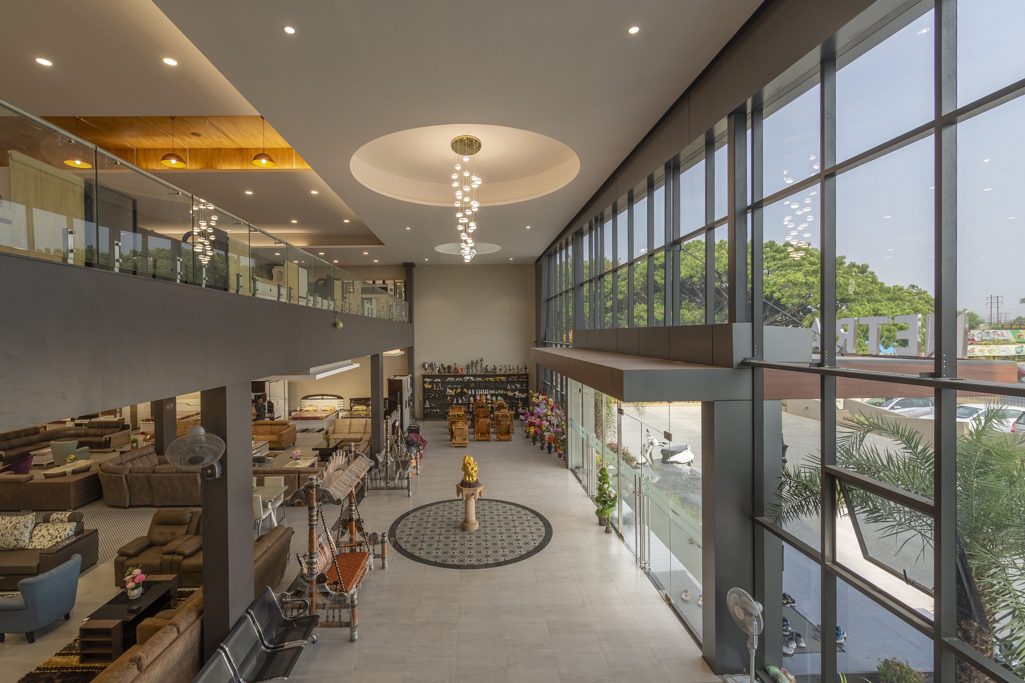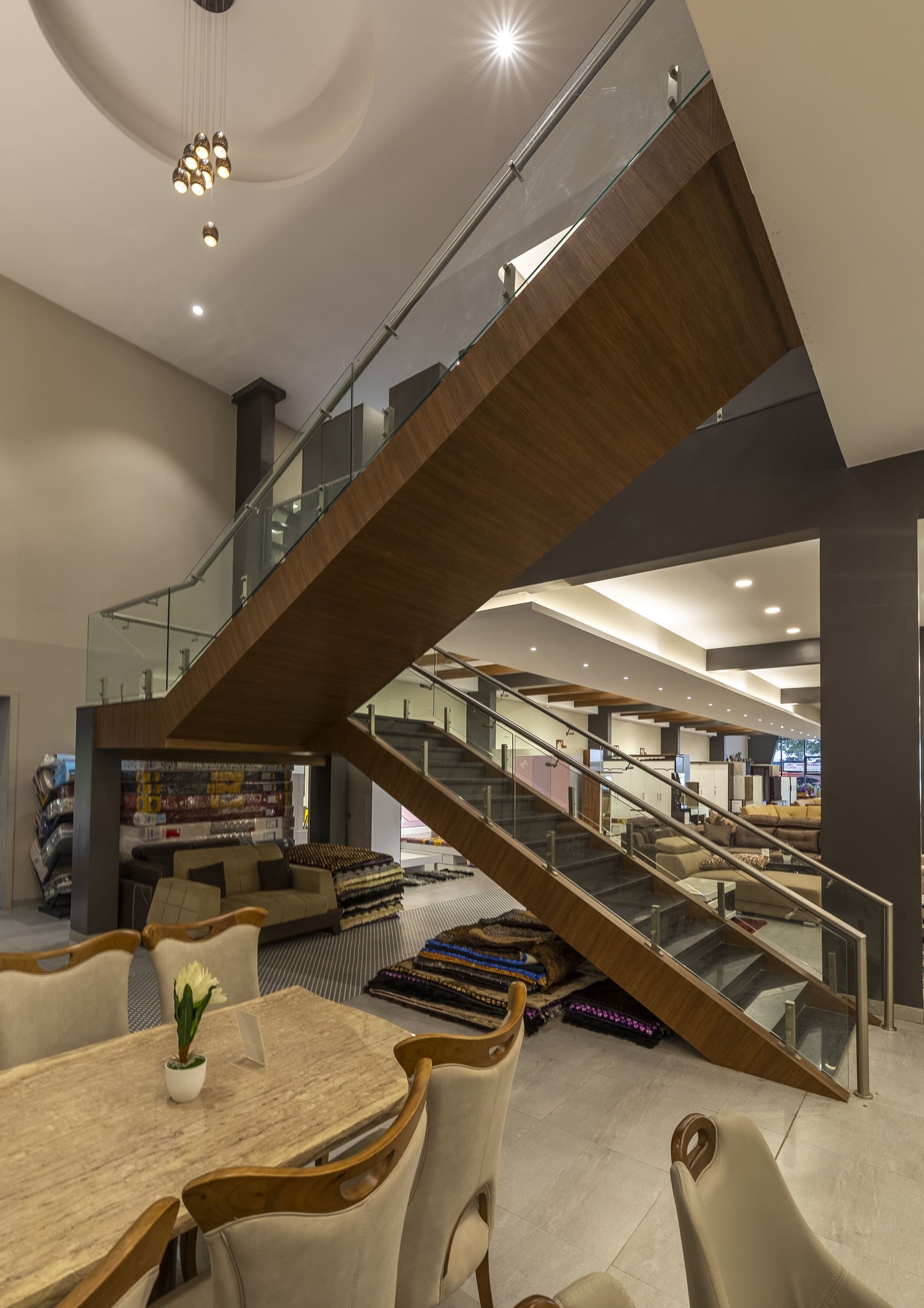 We incorporated a double height space with curtain glazing at the front and a wide, L-shaped staircase to add a sense of grandeur and volume upon entering. The store, sales counters, and owner's cabin were tucked below the staircase to maximise space for display. Overall, our goal was to create a clean, neat, and aesthetically balanced showroom with ample lighting.