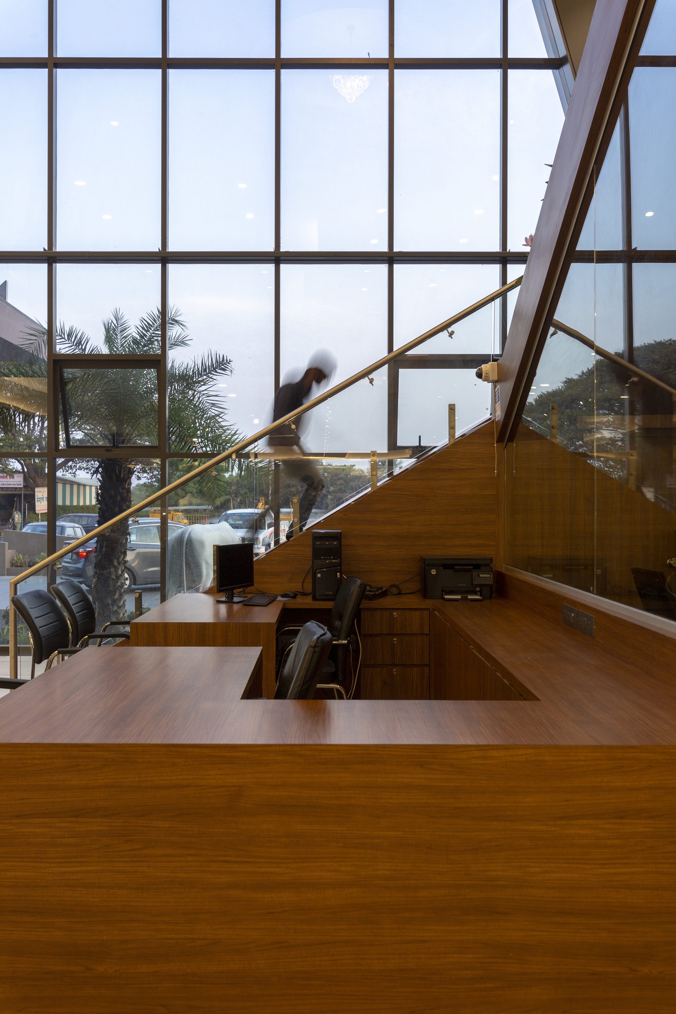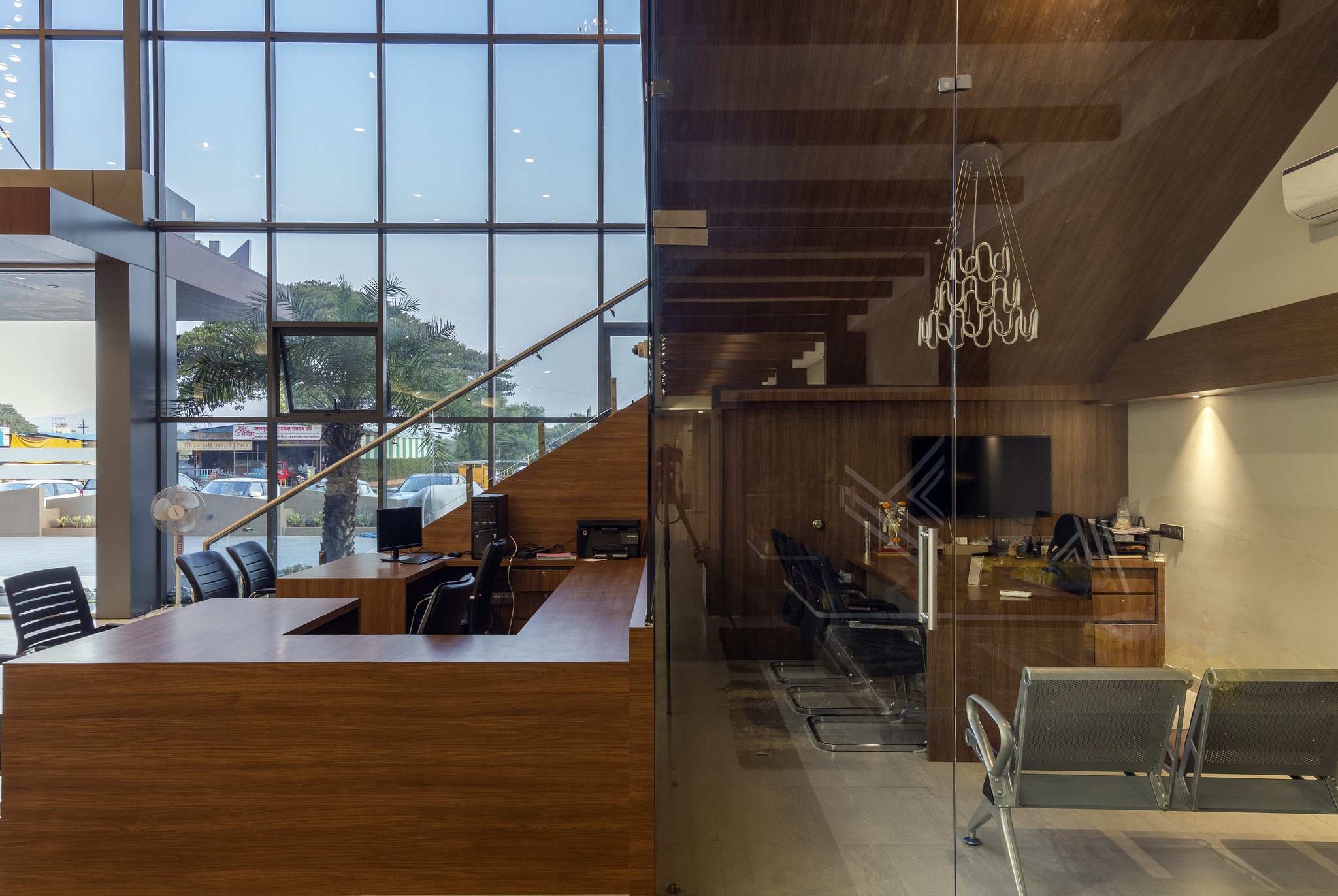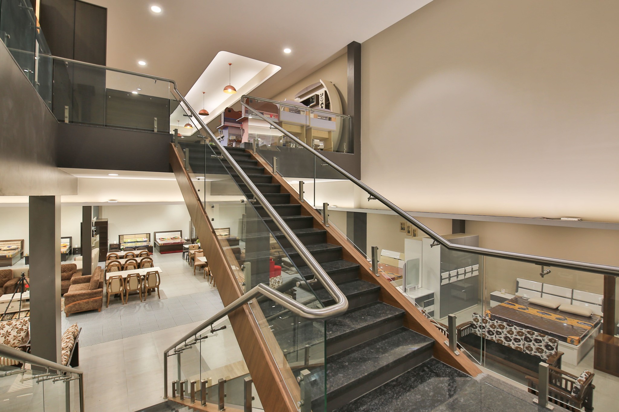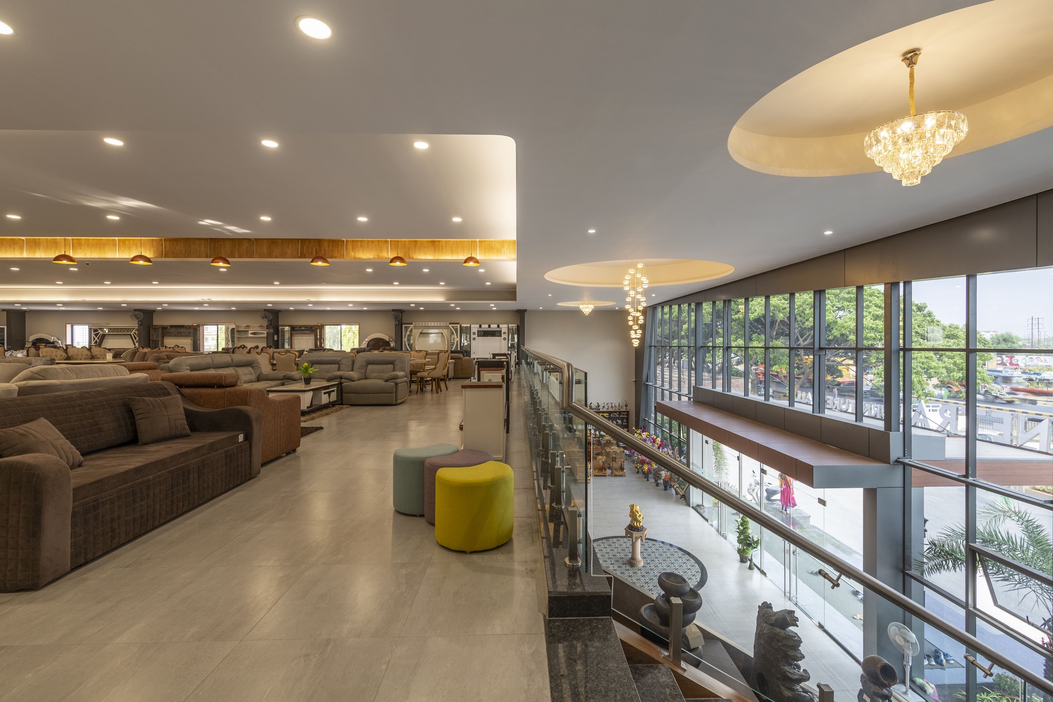 We incorporated a double height space with curtain glazing at the front and a wide, L-shaped staircase to add a sense of grandeur and volume upon entering. The store, sales counters, and owner's cabin were tucked below the staircase to maximise space for display. Overall, our goal was to create a clean, neat, and aesthetically balanced showroom with ample lighting.