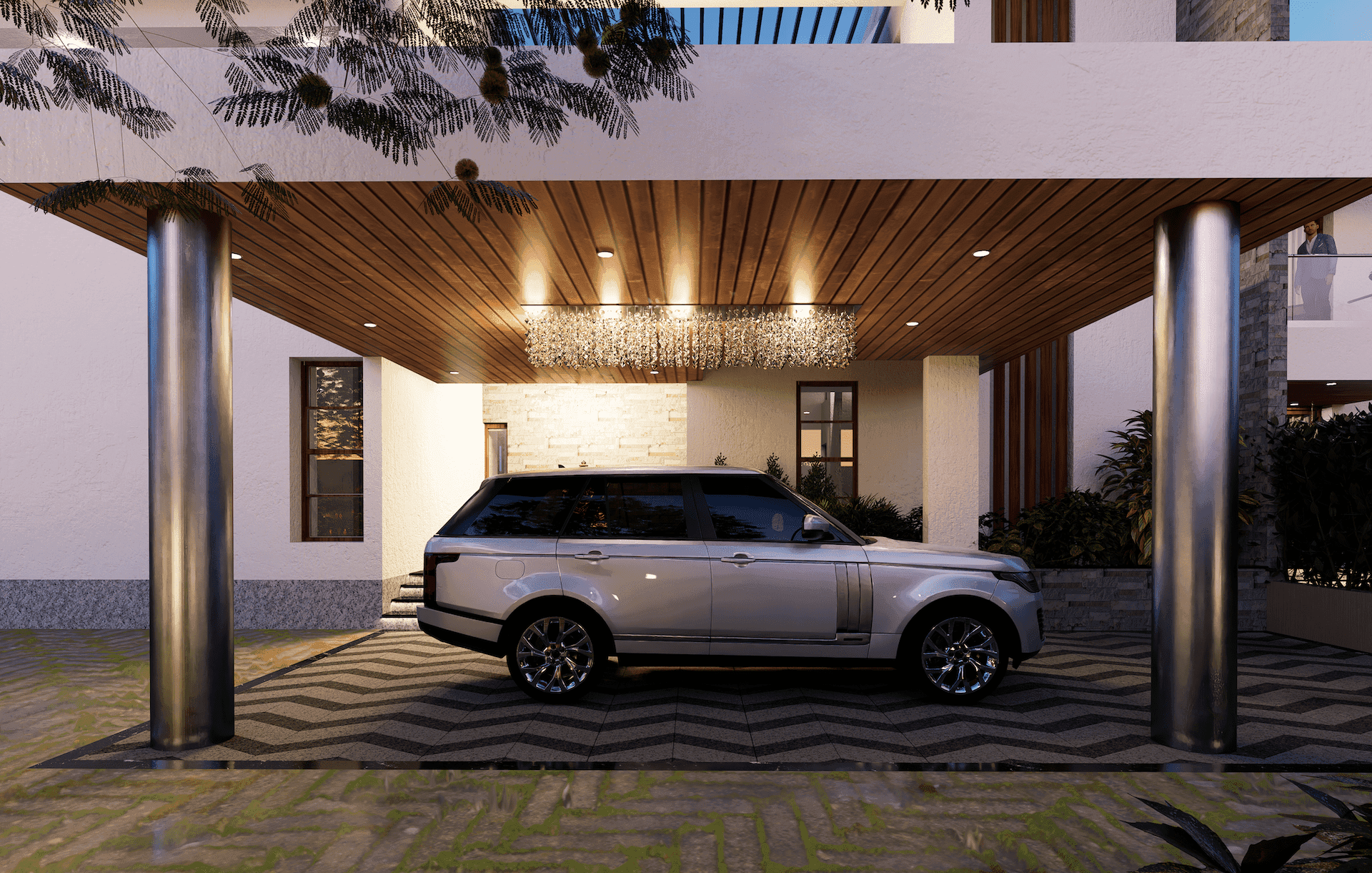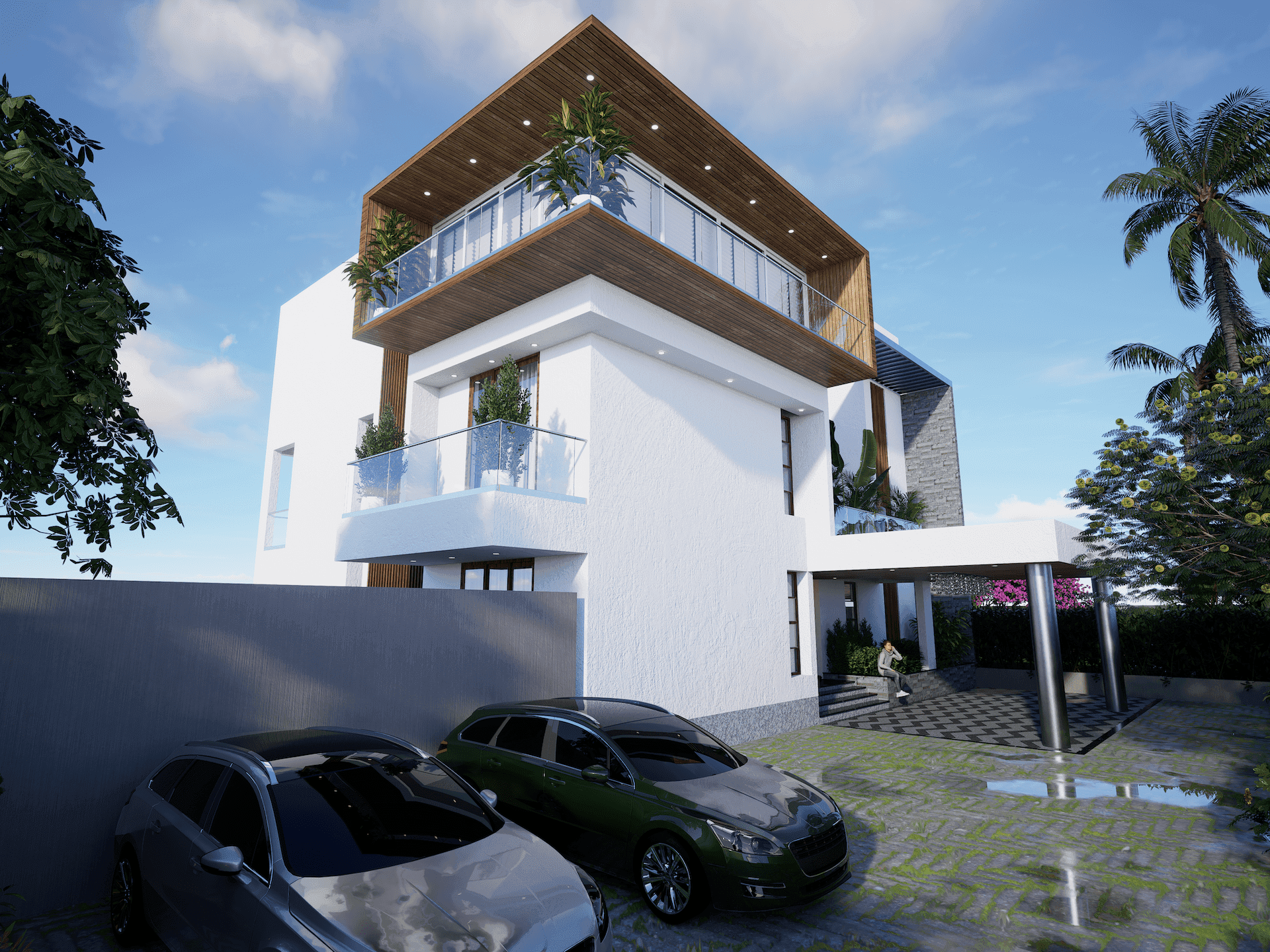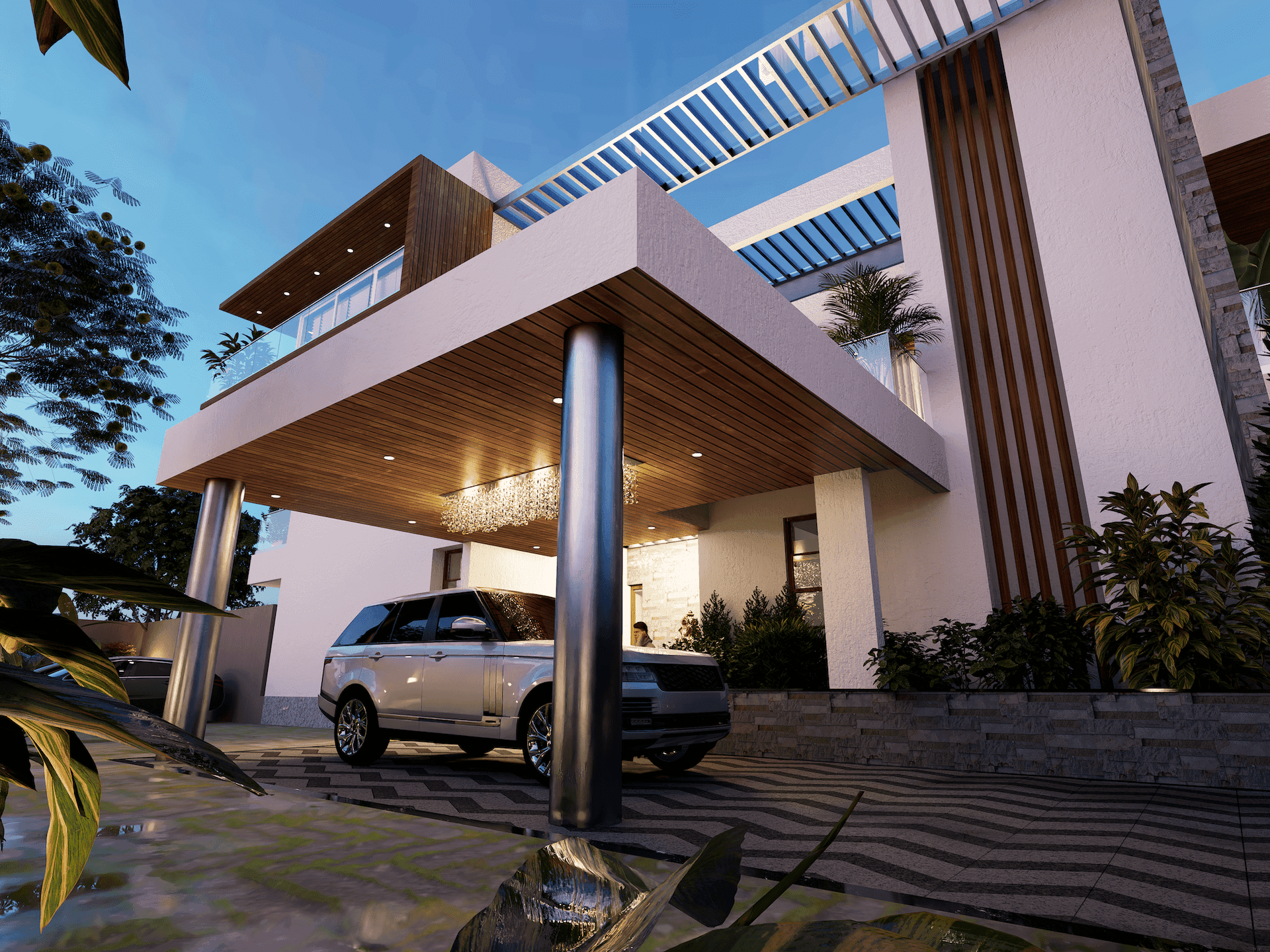 The design language for this house is characterised by clean lines and a contemporary look, with white plastered walls, wooden cladding, glass, and dark grey steel as the predominant material palette. The use of steel pergolas at various levels helps to create a sense of partial enclosure and grandeur, while the "pinching" of volumes from low to high and the play of dark and light upon entering the house add to the overall aesthetic. The result is a functional, comfortable, and aesthetically pleasing house that makes a strong visual impact.