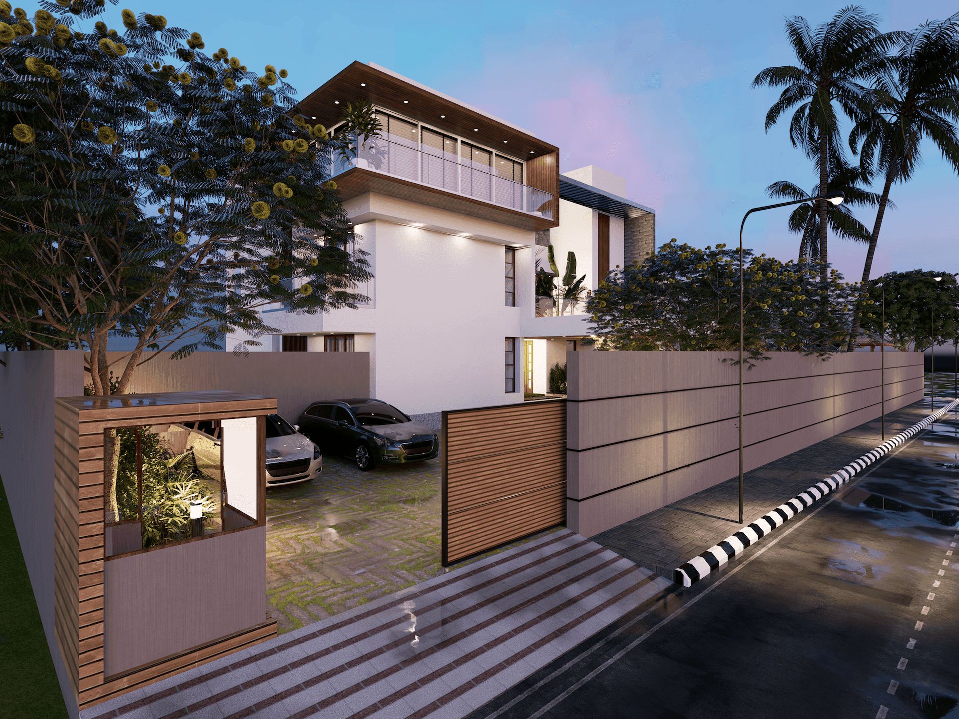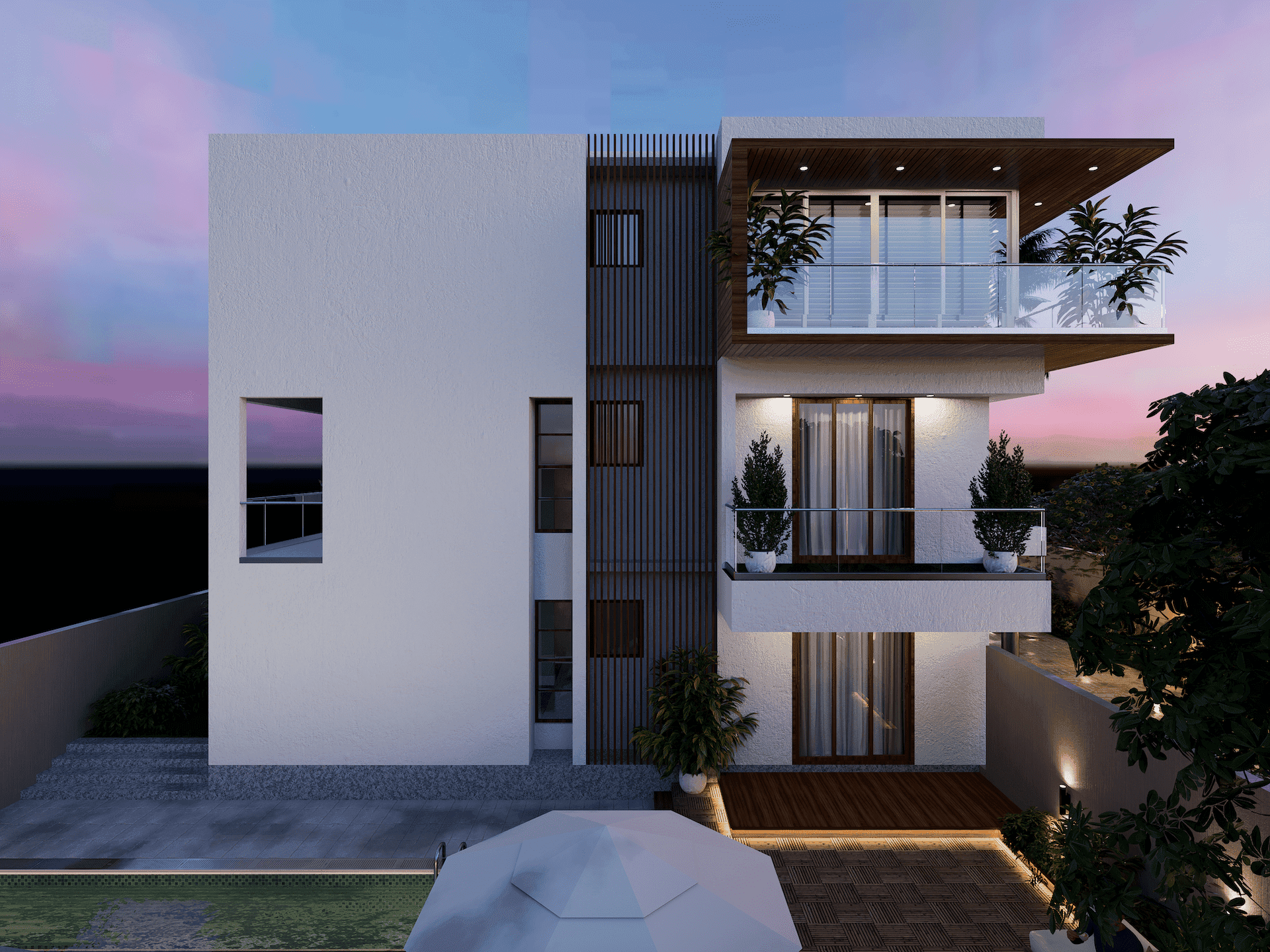 The goal of this project was to create a simple yet imposing design for a house that was grand in scale but not overly flashy or ostentatious. The design called for a large, well-lit porch that could be used for entering and exiting the house. Upon entering the house through a landscaped courtyard covered with wooden pergolas and glass, one would find a double-height living space that serves as a central bridge, with two bedrooms on one side and the kitchen, dining, and ancillary areas on the other side. The first floor contains two additional bedrooms on one side and a family room and bedroom on the other side, while the upper floor contains a home theatre, gym, and party terrace. On the ground floor, there is a large private party lawn with a gazebo for large gatherings, as well as a private swimming pool and deck attached to the master bedroom on the other side.